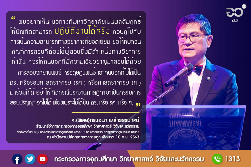 "ผมอยากเห็นแนวทางที่มหาวิทยาลัยเน้นผลสัมฤทธิ์ให้บัณฑิตสามารถปฏิบัติงานได้จริง ควบคู่ไปกับการเน้นความสามารถทางวิชาการที่ยอดเยี่ยม ขอให้ทบทวนเกณฑ์การสอบที่ต้องใช้ผู้สอนซึ่งมีตำแหน่งทางวิชาการเท่านั้น ควรให้คนนอกที่มีความเชี่ยวชาญมาสอนได้ด้วย การสอบวิทยานิพนธ์ หรือดุษฎีนิพนธ์ เอาคนนอกที่ไม่ได้เป็น ดร. หรือรองศาสตราจารย์ (รศ.) หรือศาสตราจารย์ (ศ.) มาร่วมก็ได้ อย่าให้เกิดกรณีศาลฎีกามาเป็นกรรมการสอบปริญญาเอกไม่ได้ เพียงเพราะไม่ได้เป็น ดร. หรือ รศ. หรือ ศ."