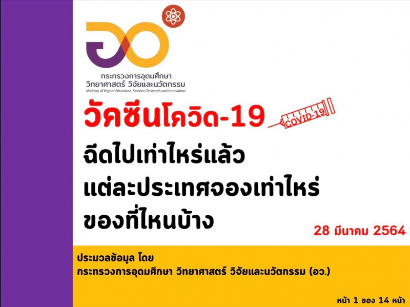 "อว. สรุปข้อมูลการฉีดวัคซีนโควิด 528 ล้านโดส ณ วันที่ 28 มีนาคม 2564