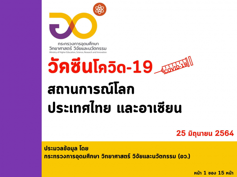 "อว. เผยฉีดวัคซีนของไทย ณ วันที่ 25 มิถุนายน ฉีดวัคซีนแล้ว 8,657,423 โดส และทั่วโลกแล้ว 2,809 ล้านโดส ใน 201 ประเทศ/เขตปกครอง ส่วนอาเซียนฉีดแล้วทุกประเทศ รวมกันกว่า 81.678 ล้านโดส โดยจังหวัดของไทยที่ฉีดมากที่สุด คือ จังหวัดภูเก็ต โดยฉีดวัคซีนเข็มแรกกว่า 63.84%”