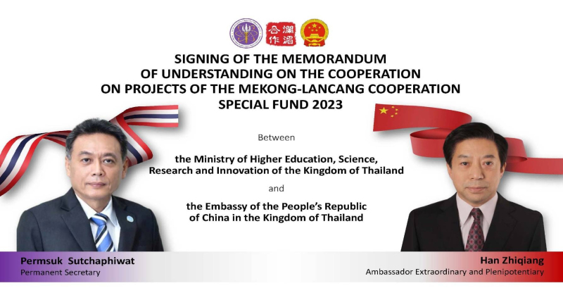 เมื่อวันที่ 18 ม.ค. นายเพิ่มสุข สัจจาภิวัฒน์ ปลัดกระทรวงการอุดมศึกษา วิทยาศาสตร์ วิจัยและนวัตกรรม (อว.) เปิดเผยว่า อว. และสถานเอกอัครราชทูตสาธารณรัฐประชาชนจีนประจำประเทศไทย ได้ร่วมลงนามในบันทึกความเข้าใจว่าด้วยความร่วมมือในโครงการภายใต้กองทุนพิเศษแม่โขง-ล้านช้าง ประจำปี 2566 (Memorandum of Understanding on the Cooperation on Projects of the Mekong-Lancang Cooperation Special Fund 2022) ซึ่งคณะรัฐมนตรีได้มีมติเห็นชอบและอนุมัติการลงนามบันทึกความเข้าใจฉบับดังกล่าว เมื่อวันที่ 2 มกราคม ที่ผ่านมา โดยมีตนเป็นผู้แทนฝ่ายไทย และ H.E. Mr. Han Zhiqiang เอกอัครราชทูตวิสามัญผู้มีอำนาจเต็มแห่งสาธารณรัฐประชาชนจีนประจำราชอาณาจักรไทย เป็นผู้แทนฝ่ายจีน ร่วมลงนาม เพื่อกำหนดแนวทางความร่วมมือระหว่างทั้งสองฝ่าย รวมถึงการบริหารจัดการโครงการที่ได้รับการสนับสนุนงบประมาณจากกองทุนพิเศษแม่โขง-ล้านช้าง เพื่อให้เกิดประสิทธิภาพและผลลัพธ์ที่เป็นรูปธรรมอย่างสูงสุด