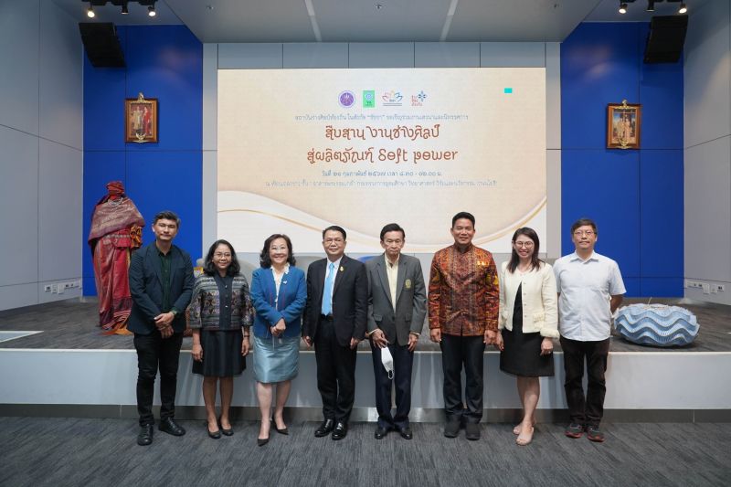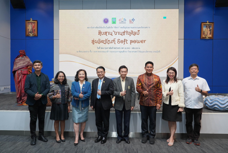เมื่อวันที่ 21 ก.พ. นายวันนี นนท์ศิริ ผู้ช่วยปลัดกระทรวงการอุดมศึกษา วิทยาศาสตร์ วิจัยและนวัตกรรม (อว.) เป็นประธานเปิดงานเสวนาและนิทรรศการงาน "สืบสานงานช่างศิลป์ สู่ผลิตภัณฑ์ Soft Power" มุ่งขับเคลื่อนการพัฒนาด้านสังคมศาสตร์ มนุษยศาสตร์ และศิลปกรรมศาสตร์ของประเทศ เพื่อนำไปสู่การสร้างคุณค่าและผลประโยชน์ทางเศรษฐกิจและสังคมของชาติ จัดโดย วิทยสถานสังคมศาสตร์ มนุษยศาสตร์ และศิลปกรรมศาสตร์แห่งประเทศไทย (ธัชชา) โดยมี น.ส.ฉัตต์ธิดา บุญโต ผู้อำนวยการธัชชา คณะผู้บริหาร ข้าราชการ และเจ้าหน้าที่เข้าร่วม ณ ห้องแถลงข่าว ชั้น 1 อาคารพระจอมเกล้า กระทรวง อว.