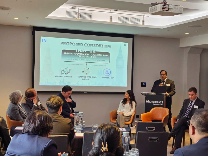 ทั้งนี้ ดร.พันธุ์เพิ่มศักดิ์ได้เสนอแนวทางการพัฒนาในอนาคต 3 ด้านหลัก ได้แก่ 1. การวิจัยและนวัตกรรมร่วม (Research and Innovation Collaboration) โดยเฉพาะสาขาเทคโนโลยีเชิงลึก เช่น AI, Green Technology และ Climate Action 2. การพัฒนาแรงงานแห่งอนาคต (Future Workforce Development) ผ่านหลักสูตรร่วม (Dual / Joint Degrees), Micro-credentials และการเรียนรู้ข้ามพรมแดน 3. การพัฒนาภาวะผู้นำและการเชื่อมโยงเชิงนโยบาย (Leadership and Policy Alignment) เพื่อขับเคลื่อนระบบอุดมศึกษาที่มีความยืดหยุ่นและยั่งยืน นอกจากนี้ ยังได้เสนอแนวคิดจัดตั้ง “Thai–UK Higher Education Strategic Leadership / President Forum” เพื่อเป็นกลไกระดับสูงในการกำหนดยุทธศาสตร์ร่วมระหว่างสองประเทศ ประกอบด้วย 3 กิจกรรมหลัก ได้แก่ 1) Annual Summit เวทีประชุมผู้นำมหาวิทยาลัยประจำปี 2) Thematic Working Groups ด้านประเด็นเฉพาะ เช่น AI, Climate, Future Skills 3) Membership Network สำหรับสร้างเครือข่ายความร่วมมือระหว่างมหาวิทยาลัยไทย–สหราชอาณาจักร