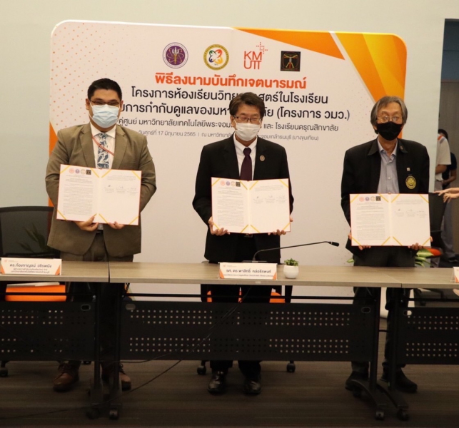 พร้อมกันนี้ รศ.ดร.สุวิทย์ แซ่เตีย อธิการบดีมหาวิทยาลัยเทคโนโลยีพระจอมเกล้าธนบุรี รับนโยบายของ อว. ในการกำหนดทิศทางเป้าหมายของโครงการที่ชัดเจน เพื่อพัฒนานักคิดและนวัตกร ที่มีฐานสมรรถนะด้านวิทยาศาสตร์ คณิตศาสตร์และเทคโนโลยีที่เข้มแข็ง และมีทักษะการเรียนรู้ที่ดี กล้าคิด กล้าสร้างสรรค์ พร้อมรับความท้าทายและเปลี่ยนแปลง เห็นคุณค่าในตัวเองและผู้อื่น รับผิดชอบต่อตนเองและสังคม เสริมสร้าง คนดี คนเก่ง ที่มีทักษะที่จำเป็นในศตวรรษที่ 21 เพื่อให้การดำเนินโครงการ วมว. ระยะที่ 3 เป็นไปตามวัตถุประสงค์และเป้าหมายการพัฒนาโครงการอย่างยั่งยืนและเป็นรูปธรรม รศ.ดร.พาสิทธิ์ หล่อธีรพงศ์ รองปลัดกระทรวงการอุดมศึกษา วิทยาศาสตร์ วิจัยและนวัตกรรม ได้ลงนามบันทึกแสดงเจตนารมณ์การดำเนินงานโครงการ วมว. ระยะที่ 3 ร่วมกับ รศ.ดร.สุวิทย์ แซ่เตีย อธิการบดีมหาวิทยาลัยเทคโนโลยีพระจอมเกล้าธนบุรี และ ดร.ก้องกาญจน์ วชิรพนัง ผู้อำนวยการสำนักงานห้องเรียนวิศว์-วิทย์ โดยรองปลัดกระทรวงการอุดมศึกษาฯ ได้เน้นย้ำว่าโครงการ วมว. ระยะที่ 3 กระทรวง อว มุ่งเน้นให้คู่ศูนย์มหาวิทยาลัยกำหนดแนวทางการขยายหลักสูตรให้โรงเรียนใกล้เคียง เพื่อส่งเสริมการเรียนการสอนด้านวิทยาศาสตร์และเทคโนโลยีในโรงเรียน และพัฒนาให้นักเรียนผลิตและคิดค้นนวัตกรรมใหม่ให้ประเทศ