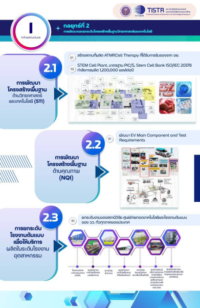 1.การพัฒนาโครงสร้างพื้นฐานวิทยาศาสตร์และเทคโนโลยี (STI)  ได้แก่ สถานที่ผลิตยาหมวดชีววัตถุ (ATMPs, Cell Therapy)  ที่ได้รับการรับรองจาก อย.  และ Stem Cell Plant  มาตรฐาน PIC/S GMP ,Stem Cell  Bank  ISO IEC  20378 กำลังผลิต 1,200,000 เซลล์/ปี โดยจะสร้างเสร็จในปี 2568 ใช้ระบบบริหารจัดการโดย Contract Development and Manufacturing Organization (CDMO)