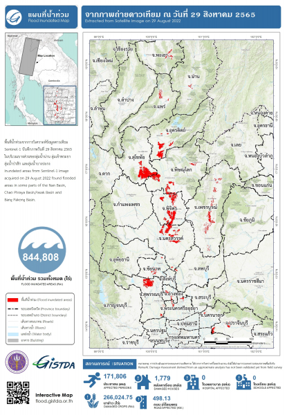 GISTDA เผยข้อมูลจากดาวเทียม Sentinel-1 (เซนทิเนล -1) ของวันที่ 29 สิงหาคม 2565 พบน้ำท่วมในพื้นที่ 4 ลุ่มน้ำหลักของประเทศ ได้แก่ ลุ่มน้ำน่าน ลุ่มน้ำเจ้าพระยา ลุ่มน้ำป่าสัก และลุ่มน้ำบางปะกง สูงถึง 844,799 ไร่ ประกอบด้วย #สุโขทัย 189,337 ไร่ #พิจิตร  156,222 ไร่ #นครสวรรค์  122,233 ไร่ #พิษณุโลก  91,382 ไร่ #อุตรดิตถ์  88,633 ไร่ #สุพรรณบุรี  70,033 ไร่ #เพชรบูรณ์  41,035 ไร่ #ปราจีนบุรี  23,641 ไร่ #ชัยนาท  17,721 ไร่ #อ่างทอง 9,344 ไร่ #พระนครศรีอยุธยา 9,269 ไร่ #พะเยา 7,662 ไร่ #แพร่ 5,767 ไร่ #นครนายก 5,763 ไร่ #น่าน 2,738 ไร่ #ลพบุรี 2,353 ไร่ #ฉะเชิงเทรา 1,508 ไร่ และ #สระบุรี 167 ไร่ ในขณะที่ข้อมูลจากดาวเทียมยังพบว่าพื้นที่ปลูกข้าวได้รับผลกระทบแล้วกว่า 266,024 ไร่ บ้านเรือนประชาชนได้รับความเดือดร้อนกว่า 1,700 หลังคาเรือน