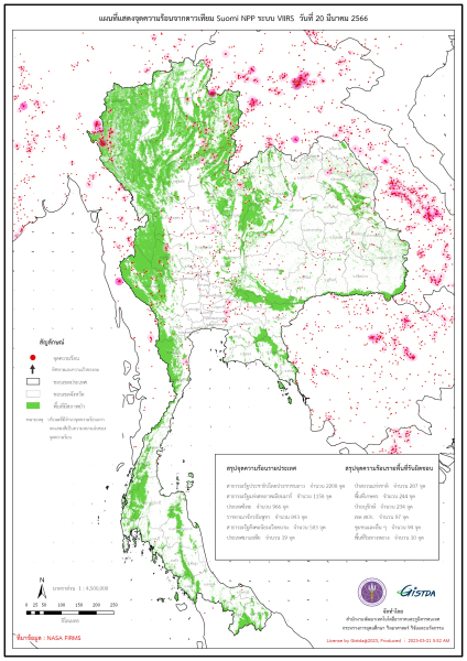 GISTDA เผยข้อมูลจากดาวเทียมซูโอมิ เอ็นพีพี (Suomi NPP) ของวันที่ 20 มีนาคม 2566 ไทยพบจุดความร้อน จำนวน 966 จุด ในขณะที่ประเทศลาวจุดความร้อนยังคงนำอยู่ที่ 2,208 จุด  ตามสาธารณรัฐแห่งสหภาพเมียนมาร์ 1,158 จุด กัมพูชา 843 จุด เวียดนาม 583 จุด และมาเลเซีย 19 จุด